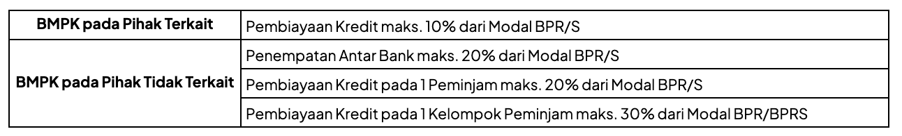 Untuk pemerataan penyaluran kredit, ada batas besaran yang harus dijadikan acuan oleh BPR dan BPRS. Berikut tabel ketentuan yang merujuk pada pihak dan pembiayaan maksimal.