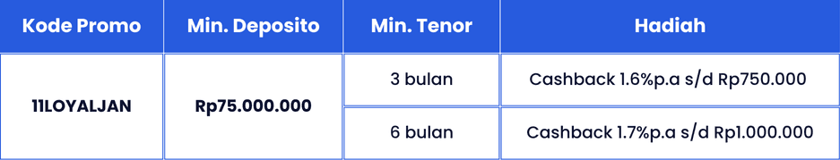 Mulai dari Deposan Baru sampai Deposan Setia, kamu bisa nikmati cashback hingga Rp1.000.000 dengan tenor fleksibel.