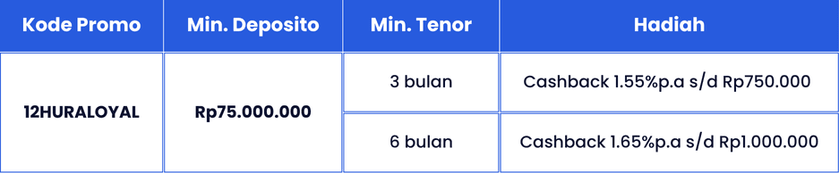 Saatnya tutup tahun dengan langkah finansial yang lebih cerdas, deposito sekarang, klaim cashback, dan nikmati cuan dari tanggal kembar 12.12! Yuk, manfaatkan sebelum periodenya berakhir!