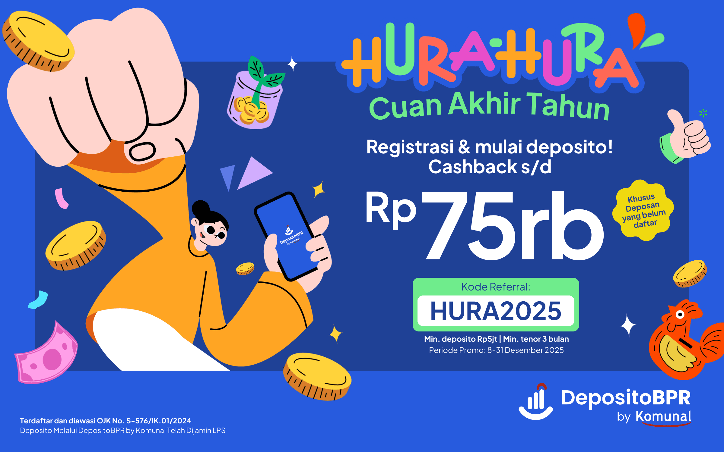 Akhir tahun nggak lengkap tanpa cuan tambahan! DepositoBPR by Komunal hadir dengan Promo Spesial yang siap bikin akhir tahunmu makin meriah. Tenang… kamu cuma perlu registrasi pakai kode referral-nya dan mulai deposito, cashback hingga Rp75 ribu menanti!