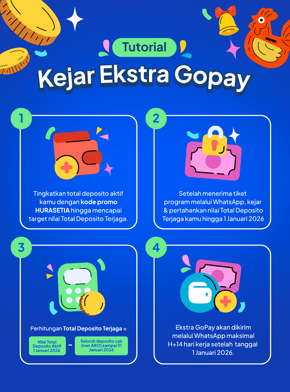 Kamu juga bisa mendapatkan ekstra GoPay hingga Rp250 ribu dengan meningkatkan & mempertahankan nilai total deposito terjaga* kamu!